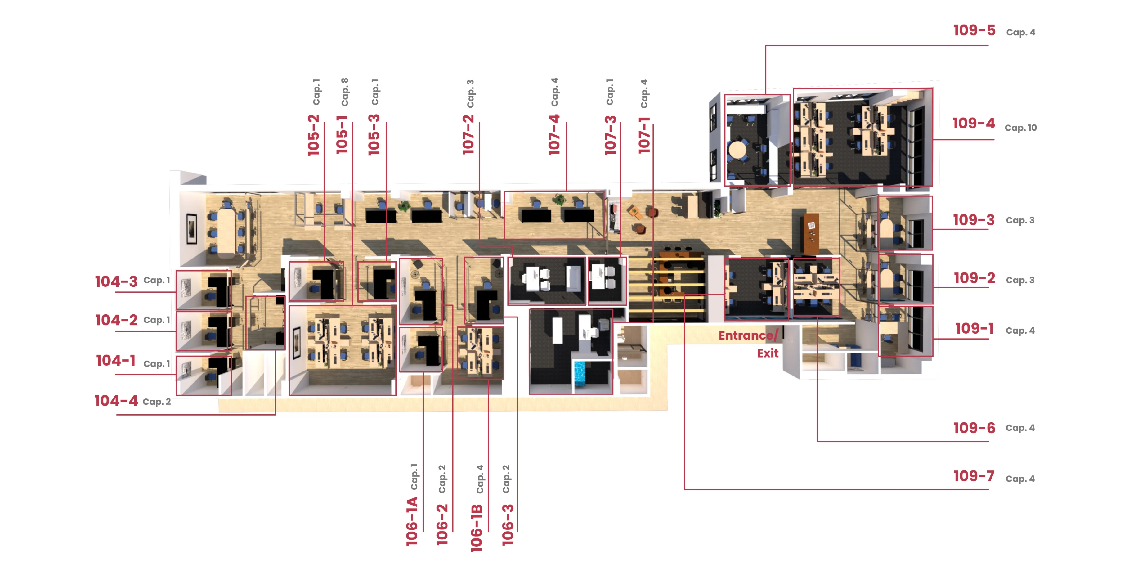Scan the visual map to compare office codes, natural light, and proximity to shared spaces.